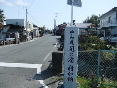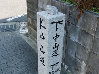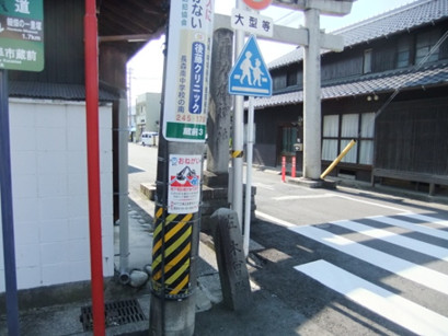 9:48 手力雄神社参道の鳥居電柱の脇には「左木曾路」の道標