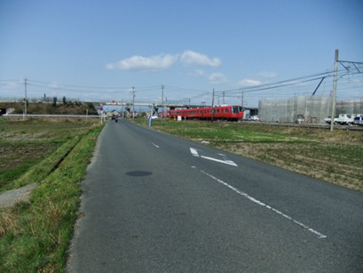 間の宿新加納を出てすぐ、東海北陸自動車道の高架をくぐると、田んぼの右側を赤い名鉄電車が走抜けて行く