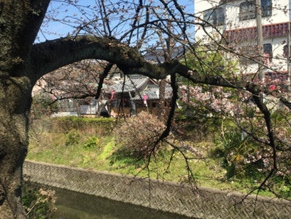 高札場跡の標識から橋の反対方向へ目を移すと桜の花越しに水薬師の旗が見えます慶長17年に川の中から黄金の薬師像が発見され、時の藩主奥平忠正と奥方亀姫(家康の娘)はこれを慶び川中に二間四方の浮見堂を建て安置した川の中から金の仏像とは、浅草の観音様のようだ大正時代まで清水川は川幅70mほどあり、ガマと呼ばれる湧水がいたる所にあったそうだ