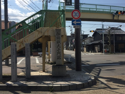 歩道橋のたもとに「加納城大手門跡」の石碑があるここが六つ目の枡形右折して進みますここから少し離れるが、加納城から少し東を境川が流れている16世紀終わり頃までは木曽川の本流は境川だったそうな