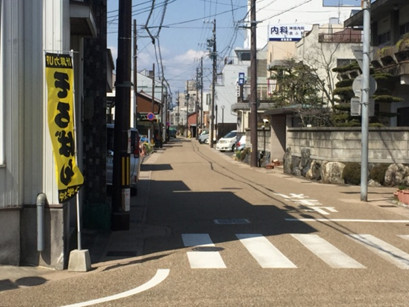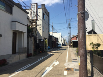 10:56 五つ目の枡形『広江の漢方太田薬局』前を左に曲がり、六つ目の枡形「加納城大手門跡」の方を見ていますこの薬局の前に「左中山道」の道標がある