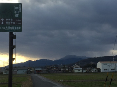 17:07 赤坂宿へ2.4kmの標識遠くの高い山は伊吹山