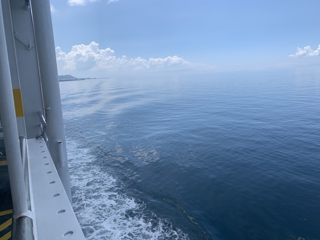 帰路は徳島(沖洲)ターミナルから東京港(有明)フェリーターミナルまでのルート。午前11時20分発、翌日午前5時30分着、約18時間の船旅船内にはレトルト食品・冷凍食品が豊富に用意されており、24時間好きな時間に利用が出来ました。電子レンジと給湯器が自由に利用可能。海が見えて開放感あふれる大風呂に入りました。波が荒かったため、船の揺れに合わせて、お湯が右の湯船から左の湯船に移動、揺れ戻しで左から右へ。ざざざーと大量のお湯が移動。湯船にしっかりつかまっていないと体がもっていかれます。船酔いはしない方ですが、今回は出港して間もなく、緩やかな揺れが大きく、廊下も手すりにつかまりながら歩く様。少し気分が悪くなり、船室で休むことにしました。しばらくしてだんだん慣れてきたので、開放的なエントランスホール(船内共有スペース)で、海を見ながらの遅い昼食を。東京に近ずくと滑るように船は走っています。いよいよ東京湾に入った感じ。まもなくして接岸、そして下船。我が家に戻り、四国旅を無事終えることが出来ました。